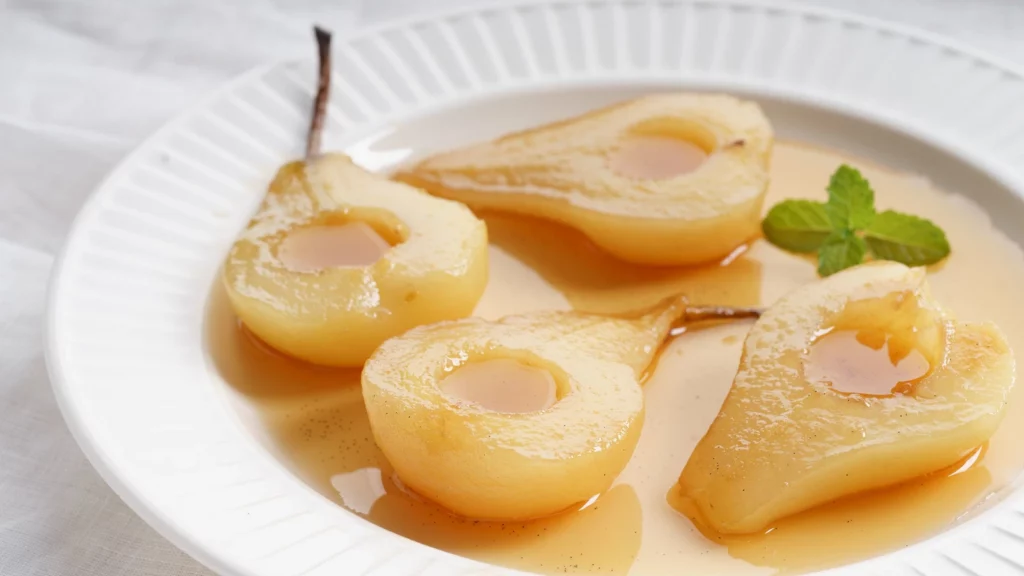 - Sortez les poires et, si besoin, réduisez le sirop pour le rendre sirupeux.
